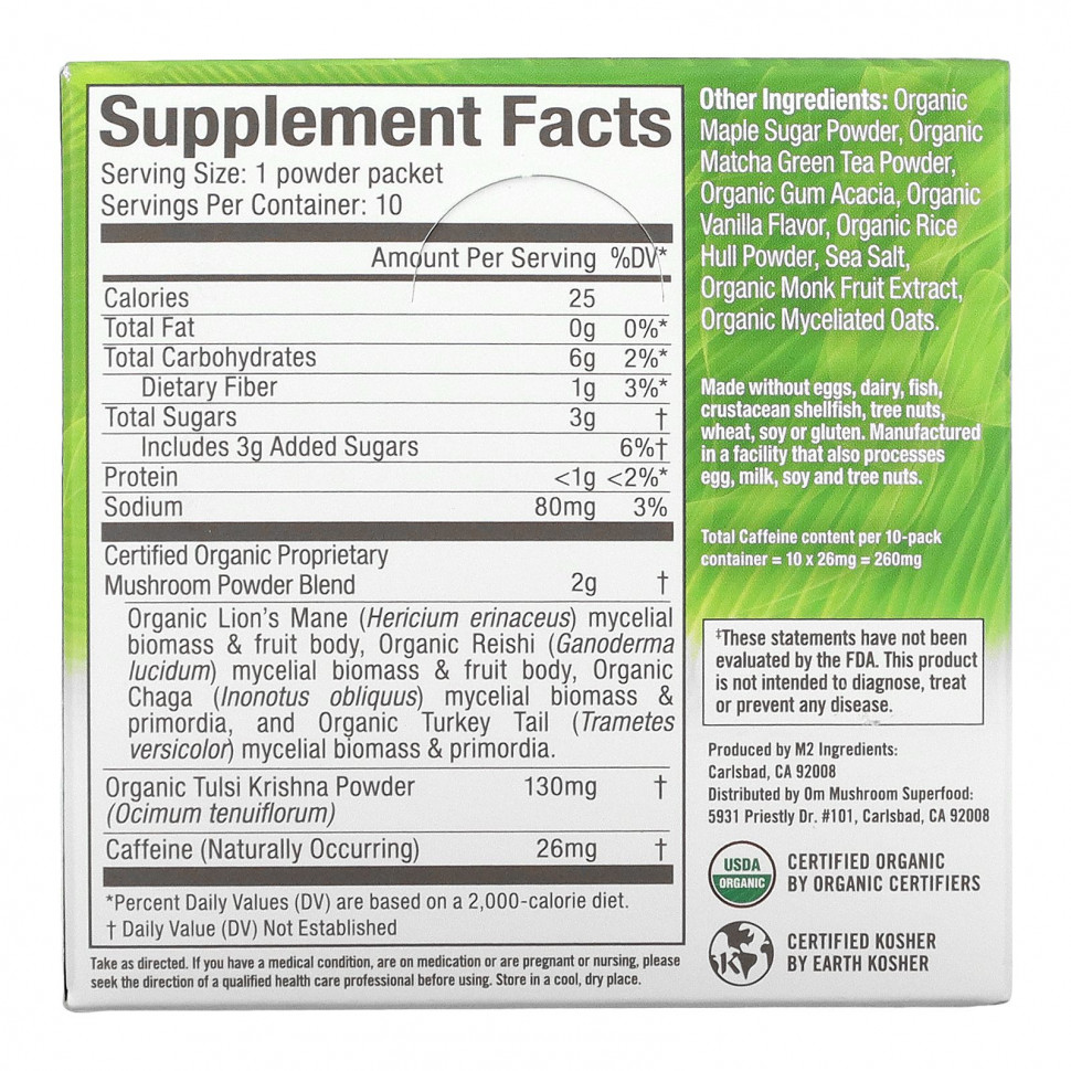 Каждая порция омолаживающей смеси латте с грибами и маття содержит 2000 мг сертифицированного 100% органического порошка из цельных пищевых грибов с полным спектром питательных веществ.