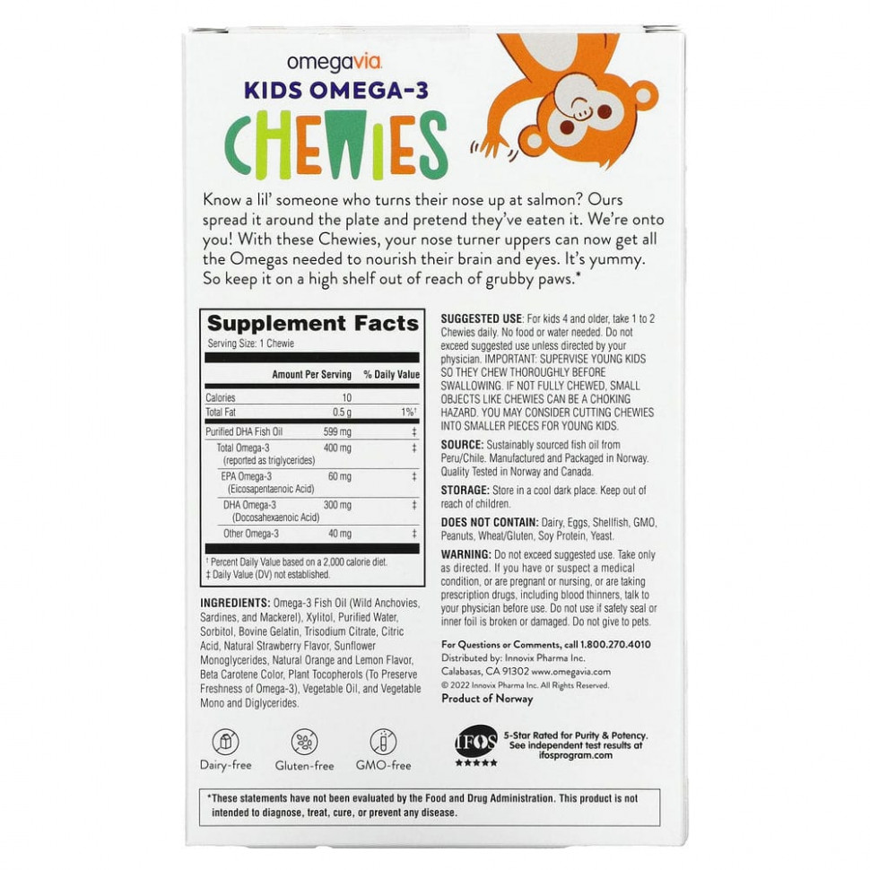 Знаете ли вы детей, которые отказываются от блюд из лосося? Наши размазывают еду по тарелке и делают вид, что поели. Мы с вами! Благодаря этим жевательным таблеткам ваши привереды теперь могут получать омега-кислоты и витамины К и D3 для питания мозга, глаз и костей. Это вкусно. Поэтому храните жевательные таблетки на высокой полке в недоступном для маленьких ручек месте.