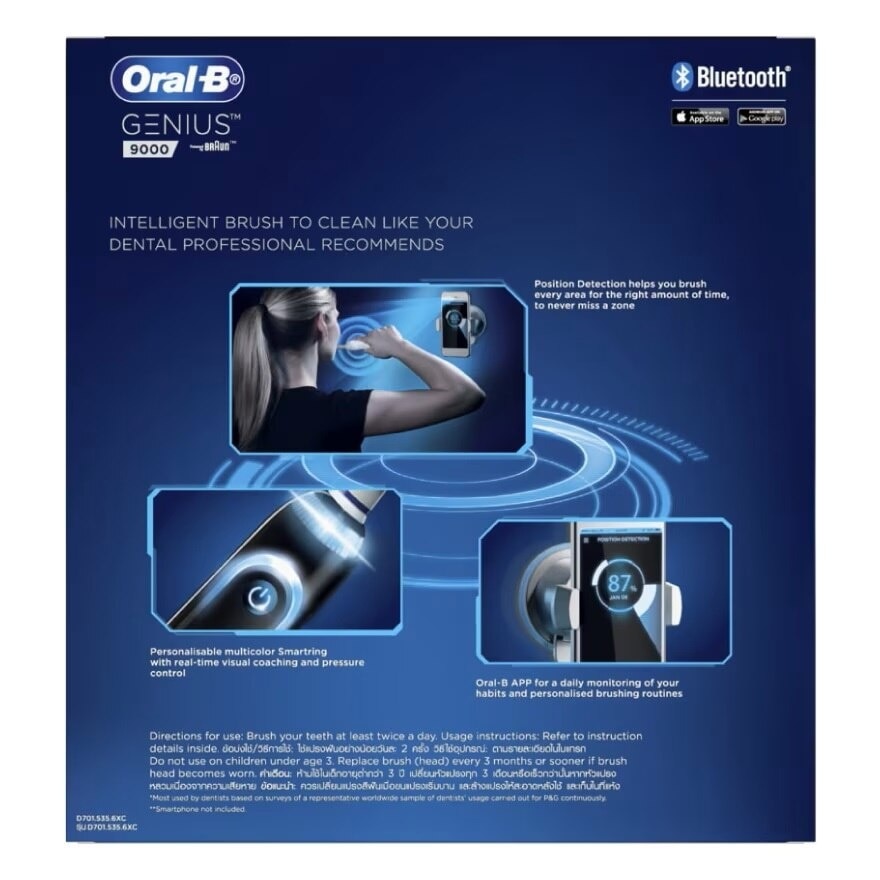 Oral-B Electric Power Toothbrush Genius 9000 Midnight Black Rechargeable Electric Toothbrush with position detection. An intelligent brush to clean like your dental professional recommends. Removes 100% more plaque. Oral-B is the 1 Toothbrush brand used by dentists worldwide. Its round head cleans better for healthier gums. 100% brushing coverage the only brush with Position Detection that sees where you brush and guides you to never miss a zone Protect your gums Pressure Control reduces brushing speed and Smart Ring alerts you if you brush too hard Know you ve brushed the right amount of time with the 2-minute professional timer Personalised experience with 6 different brushing modes including PRO Clean, Whitening, Gum Care, Sensitive and Tongue Clean Includes a Smart Travel Case which charges your toothbrush and smartphone on-the-go Contents 1 Genius 9000 Midnight Black Bluetooth-Connected Handle (6 modes), Smart Travel Case, Charging Station, Smartphone Holder, 3 Toothbrush Heads Compatible with the following Oral-B toothbrush heads Cross Action, 3D White, Gum Care, Sensitive Clean, Precision Clean, Floss Action vs. a regular manual toothbrush Brush your teeth at least twice a day. Recommended usage Clean the brush after use and keep in dry place. Usage instructions Refer to instruction details inside. Do not use on children under age 3. Replace brush (head) every 3 months or sooner if brush head becomes loose due to damage. Tel 1-800-295-545