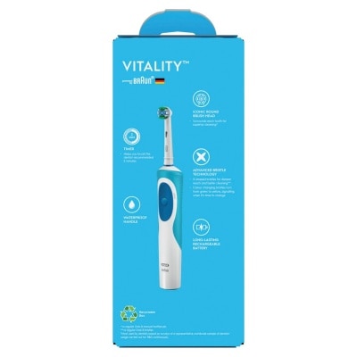 Oral-B Vitality Precision clean 1 Electric Brush Handle + 1 Brush Head + 1 Charger is clinically proven to remove more plaque than an ordinary manual toothbrush while leaving your whole mouth cleaner with healthier gums Advanced cleaning technology Oral-B Precision Clean Brush Head surrounds each tooth for an individual cleaning. — Precision clean cup shaped bristles reaches deep between teeth to help remove plaque more than a regular manual toothbrush. — 2 Minute Timer Helps you brush the dentist recommended 2 minutes. — 2D Action High speed oscillating and rotating motion. — Rechargeable battery Lasts up to 8 days (2min, 2x/day)