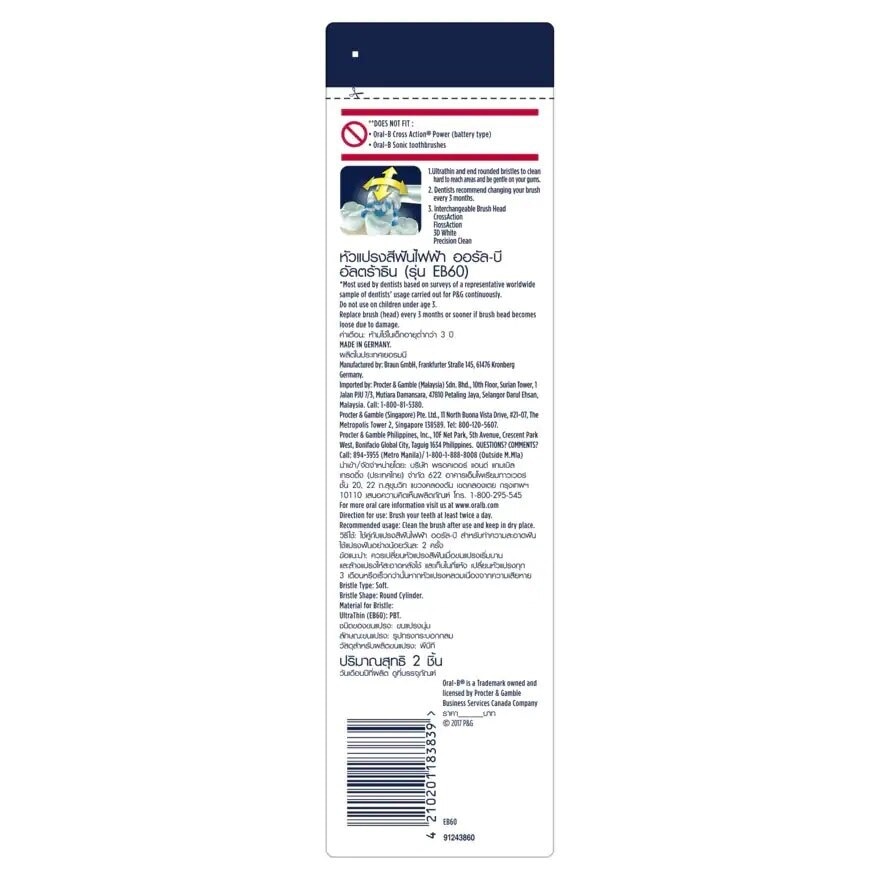 Oral-B Electronic Toothbrush Ultrathin Brush head for deeper clean when compared to manual toothbrush Soft and Gentle on Gums Brush head cups each tooth for better and deeper clean Comes with Indicator that tells you when to change the brush Can be used with any rechargeable Oral-B Electric toothbrush handle (except iO, Battery and Sonic) No.1 brand recommended by dentists worldwide Usage details use to brush teeth twice/day Warning Do not use with children younger than 3 years old. Change brush head every 3 months or sooner if the brush starts getting loose. Tel 1-800-295-545