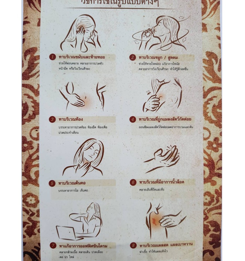 Тайский оранжевый бальзам используют в качестве самостоятельного массажного средства и в комбинации с базовыми маслами. А также для быстрой помощи при укусах насекомых.