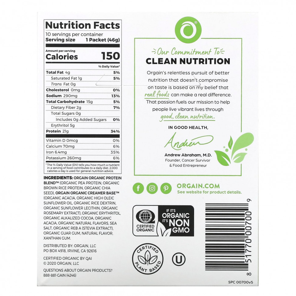 Смесь Orgain Organic Protein Blend™ (органический гороховый протеин, органический протеин из коричневого риса, органические семена чиа), основа Orgain Organic Creamer Base™ (органическая акация, органическое высокоолеиновое подсолнечное масло, органический рисовый декстрин, органический подсолнечный лецитин, экстракт органического розмарина), органический эритритол, органическое обработанное щелочью какао, органическая акация, органические натуральные ароматизаторы, морская соль, органический реб А (экстракт стевии), органическая гуаровая камедь, натуральный ароматизатор, ксантановая камедь.