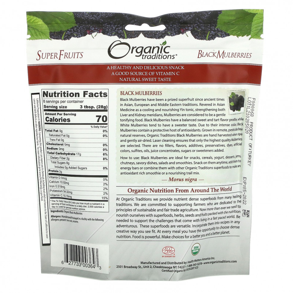 Черная шелковица с древних времен считалась суперфруктом в азиатских, европейских и ближневосточных традициях. В азиатской медицине шелковица считается охлаждающим и питающим инь-тоником, укрепляющим меридианы печени и почек. Черная шелковица имеет сбалансированный сладкий и терпкий вкус, а белая шелковица имеет более сладкий вкус. Благодаря насыщенному цвету черная шелковица содержит множество антиоксидантов. Черная шелковица Organic Traditions, выращенная в отдаленных природных заповедниках, не содержит пестицидов, собирается вручную и сушится на воздухе. Благодаря лазерной очистке будет отобрана шелковица только самого высокого качества. Не содержит наполнителей, ароматизаторов, добавок, консервантов, красителей, искусственных красителей, сульфитов, масел, концентратов соков, сахара и подсластителей.