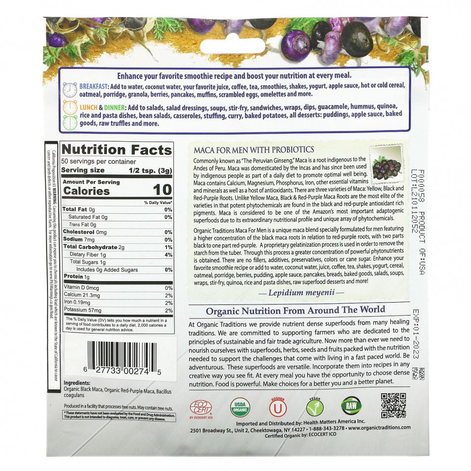 Мака для мужчин от Organic Traditions — это уникальная смесь маки, специально разработанная для мужчин. В состав корня маки входит более высокая концентрация корней мака по сравнению с корнями красно-фиолетового цвета: две части черного и одна часть красно-фиолетового цвета. Для удаления крахмала из клубня используется запатентованный процесс желатинизации. Благодаря этому достигается большая концентрация эффективных фитонутриентов. Без наполнителей, добавок, консервантов, красителей и тростникового сахара. Улучшите свой любимый рецепт смузи или добавьте в воду, кокосовую воду, сок, кофе, чай, коктейли, йогурт, хлопья, овсянку, кашу, ягоды, пудинг, яблочный соус, блины, хлеб, выпечку, салаты, супы, обертывания, перемешивание — жареные блюда, киноа, рис и паста, сырые десерты из суперфудов и многое другое!