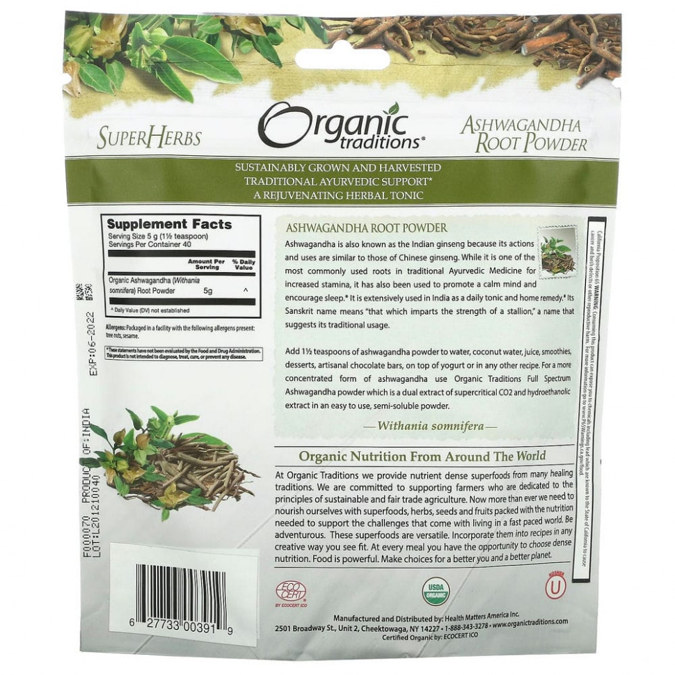 Ашваганда также известен как индийский женьшень, потому что его действие и использование аналогичны китайскому женьшеню. Хотя это один из наиболее часто используемых корней в традиционной аюрведической медицине для повышения выносливости, он также используется для успокоения ума и улучшения сна. Он широко используется в Индии в качестве ежедневного тонизирующего и домашнего средства. Его название на санскрите означает «то, что придает силу жеребца», название, которое предполагает его традиционное употребление.