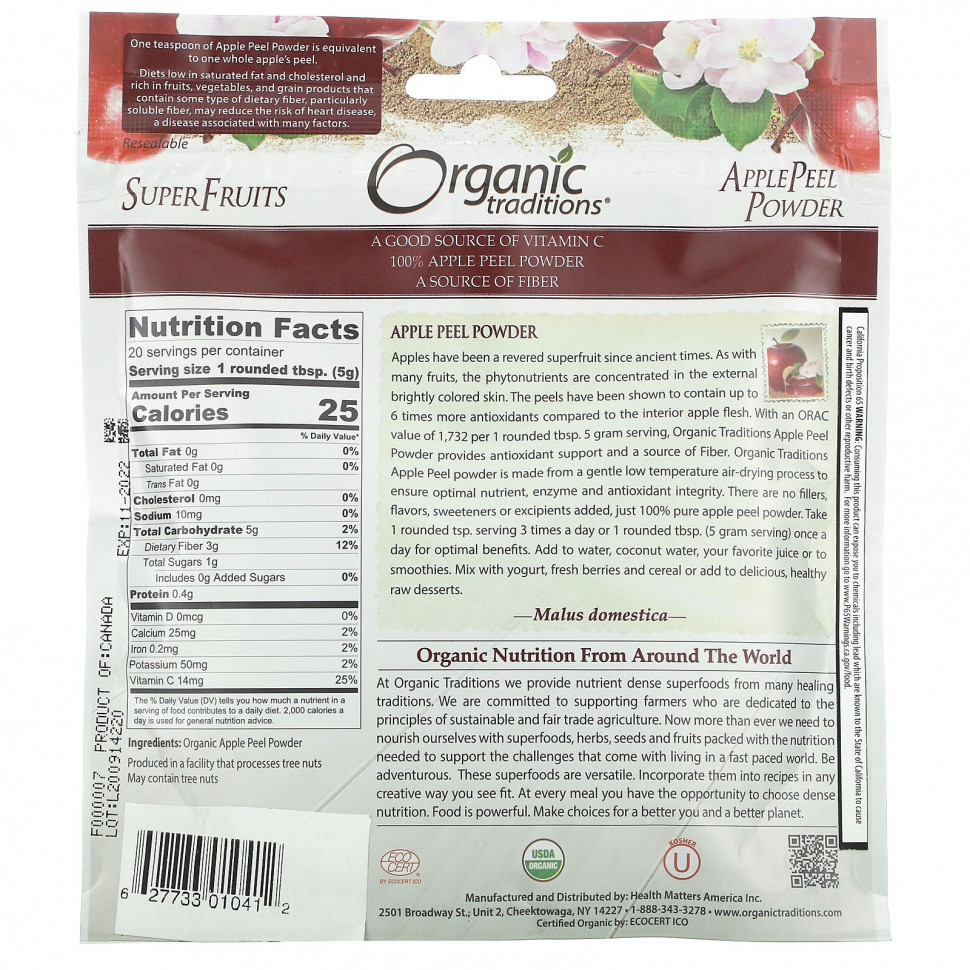 Яблоки издревле считались суперфруктами. Как и во многих фруктах, фитонутриенты сосредоточены во внешней ярко окрашенной коже. Доказано, что кожура содержит в 6 раз больше антиоксидантов по сравнению с мякотью яблока. При значении ORAC 1732 в 1 ст. 5-граммовая порция порошка из органической яблочной цедры обеспечивает антиоксидантную поддержку и является источником клетчатки. Порошок из яблочной цедры от Organic Traditions производится с помощью бережной сушки на воздухе при низкой температуре, чтобы обеспечить оптимальную целостность питательных веществ, ферментов и антиоксидантов. Не содержит наполнителей, ароматизаторов, подсластителей и вспомогательных веществ, только 100% чистый порошок из яблочной кожуры. Возьмите 1 ч. Л. С горкой. порции 3 раза в день или по 1 ст. л. с горкой. (Порция 5 грамм) один раз в день для оптимального эффекта.