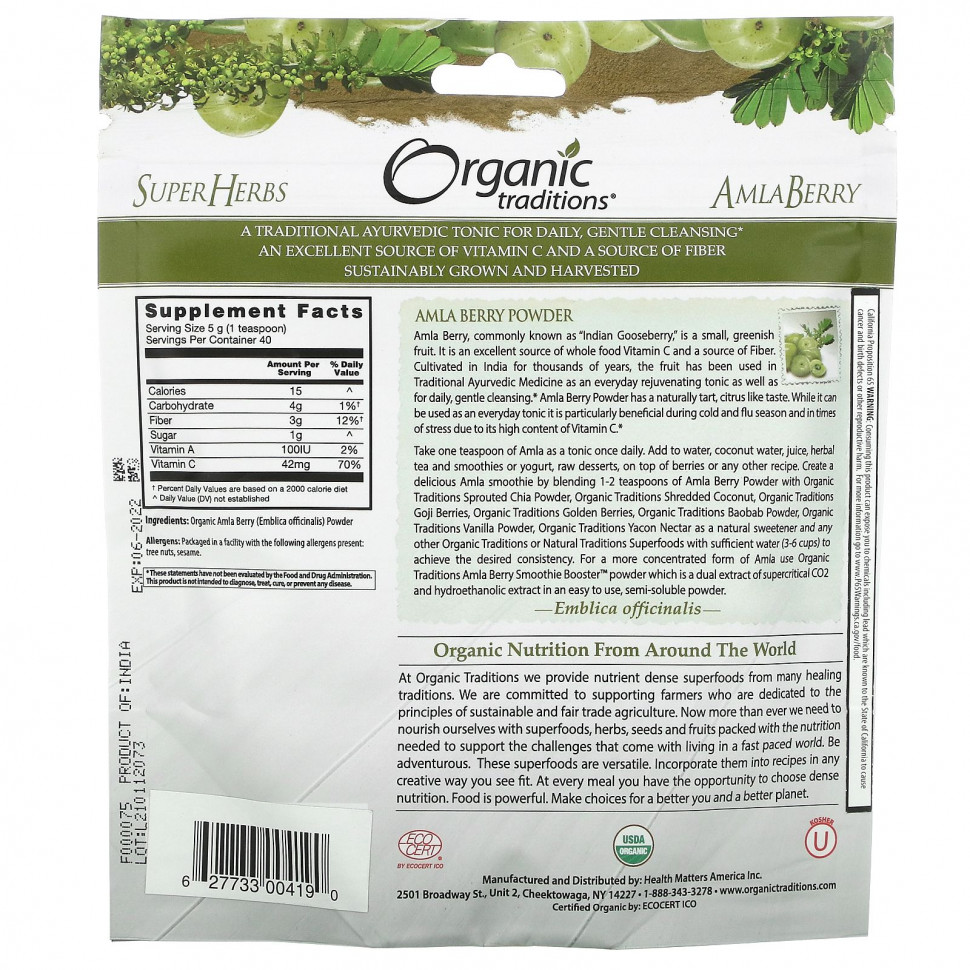 Амла Берри, широко известная как «индийский крыжовник», представляет собой небольшой зеленоватый фрукт. Это отличный источник цельного пищевого витамина С и источник клетчатки. Плоды, выращиваемые в Индии на протяжении тысячелетий, используются в традиционной аюрведической медицине в качестве ежедневного омолаживающего тоника, а также для ежедневного мягкого очищения. Amla Berry Powder имеет натуральный терпкий, цитрусовый вкус. Хотя его можно использовать как повседневное тонизирующее средство, оно особенно полезно во время сезона простуды и гриппа, а также во время стресса из-за высокого содержания витамина С.