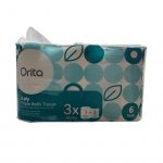 Orita Triple Rolls Tissue is made from 100% virgin forest fibre with no fluorescent additives. It has a length of 50 meters which is triple the size of regular tissue paper rolls. Pack size : 2 ply x 50 metres/roll x 6 rolls