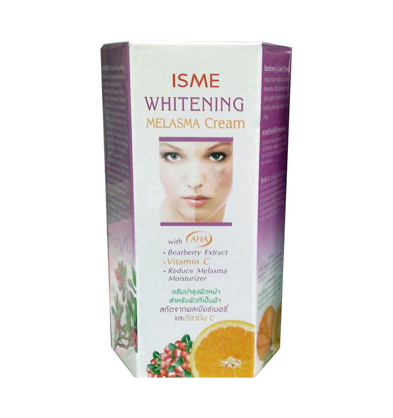 Избавиться от пигментных пятен поможет Isme Whitening Melasma Cream, активными действующими компонентами которого выступают экстракт толокнянки и витамин С. Отбеливающий крем с экстрактом толокнянки (медвежьего ушка), витамином С и другими растительными экстрактами устраняет мелазму, хорошо увлажняет кожу, регулирует образование меланина.