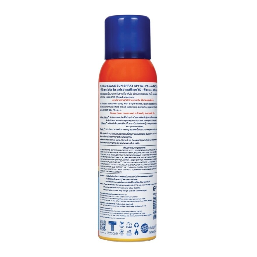 P.O. Care Aloe Sun Spray SPF50+ PA++++ Face and Body Sunscreen spray with lightweight texture and quickly dry formula. Very water resistant. Efficiently protect the skin from UVA1, UVA2, UVB, and IR+ with SPF50+ PA++++ for more than 12 hours. Also riches in natural extracts to protect the skin, nourish and moisturise the skin throughout the day. Do not harm corals and is friendly to aquatic life. Shake before using. Spray it on face and body before sun exposure the sun. Should reapply during the day and wash off at night.