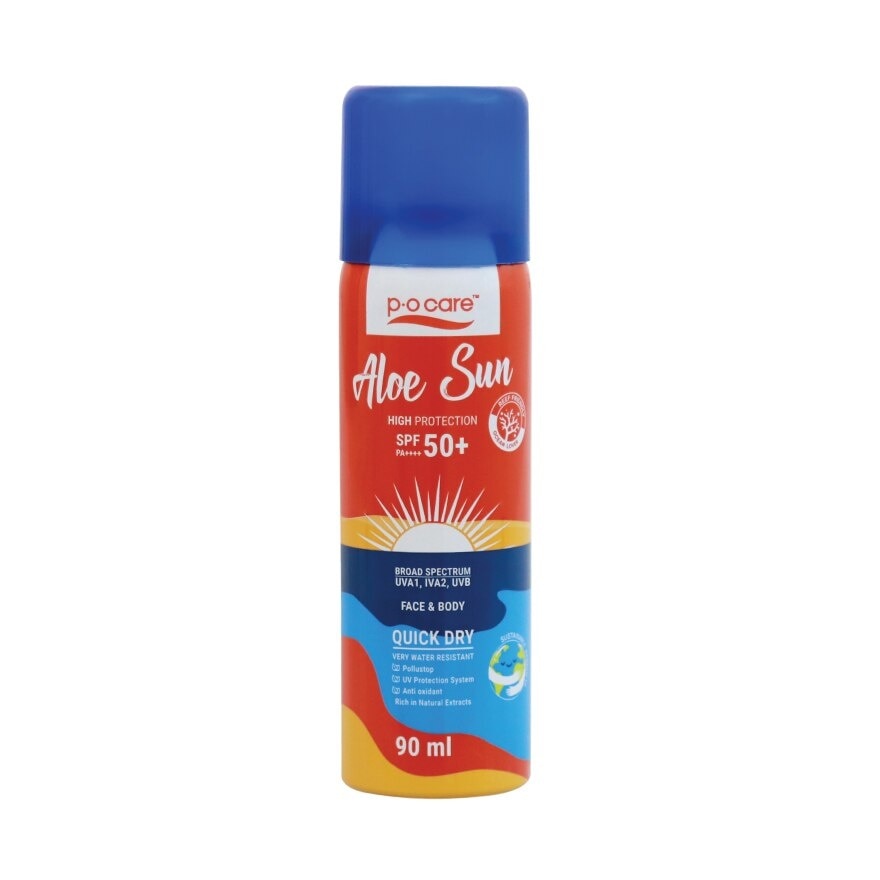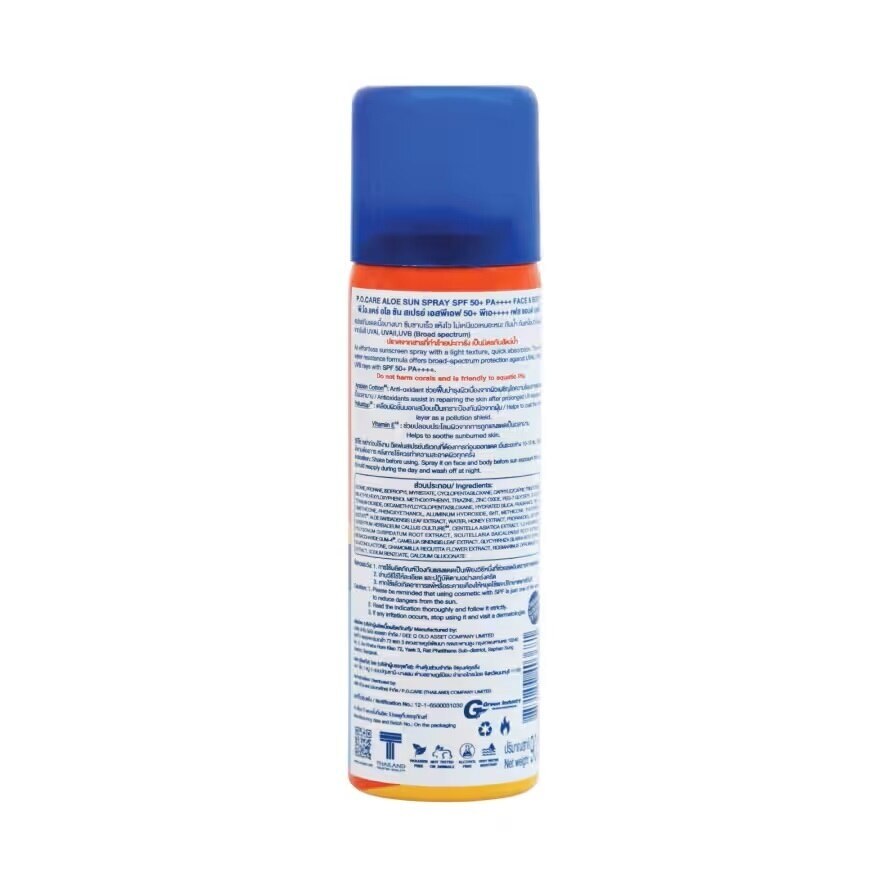 P.O. Care Aloe Sun Spray SPF50+ PA++++ Face & Body Sunscreen spray with lightweight texture and quickly dry formula. Very water resistant. Efficiently protect the skin from UVA1, UVA2, UVB, and IR+ with SPF50+ PA++++ for more than 12 hours. Also riches in natural extracts to protect the skin, nourish and moisturise the skin throughout the day. Do not harm corals and is friendly to aquatic life. Shake before using. Spray it on face and body before sun exposure the sun. Should reapply during the day and wash off at night.