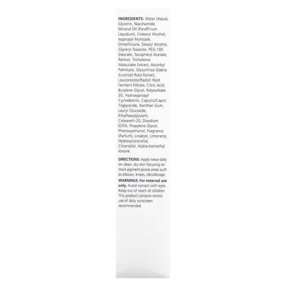 Вода, глицерин, никотинамид, минеральное масло (Paraffinum liquidum), цетеариловый спирт, изопропил миристат, диметикон, стеариловый спирт, глицерил стеарат, ПЭГ-100 стеарат, токоферилацетат, ретинол, экстракт гриба мацутакэ (Tricholoma matsutake), аскорбил пальмитат, экстракт корня солодки (Glycyrrhiza glabra), лейконосток/ферментированный фильтрат корня редиса, лимонная кислота, бутиленгликоль, полисорбат 20, гидроксипропил циклодекстрин, каприловый/каприновый триглицерид, ксантановая камедь, лаурил глюкозид, этилгексилглицерин, цетеарет-20, двунатриевая ЭДТК, пропиленгликоля, феноксиэтанол, отдушка (парфюмерная композиция), линалоол, лимонен, гидроксицитронеллаль, цитронеллол, альфа-изометилионон.