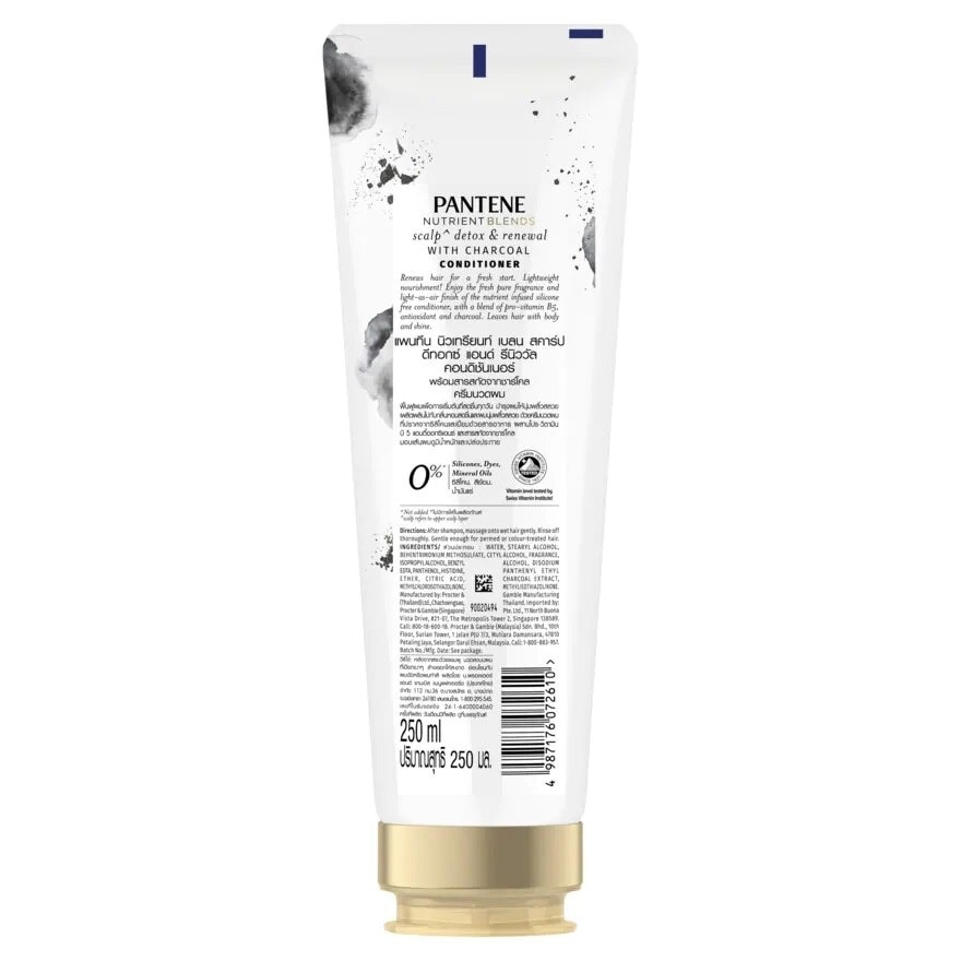 Pantene Pro-V Conditioner Nutrient Blends Scalp Detox & Renewal Enjoy the fresh pure fragrance and light as air finish of the nutrient infused silicone free conditioner with a blend of pro-vitamin B5 antioxidant and charcoal. Leaves hair with body and shine. Deeply detox from the roots for free-flowing hair 0% Silicones Dyes Mineral Oils Vitamin level tested by Swiss Vitamin Institute. After shampoo massage onto wet hair gently. Rinse off thoroughly. Gentle enough for permed or colour treated hair.