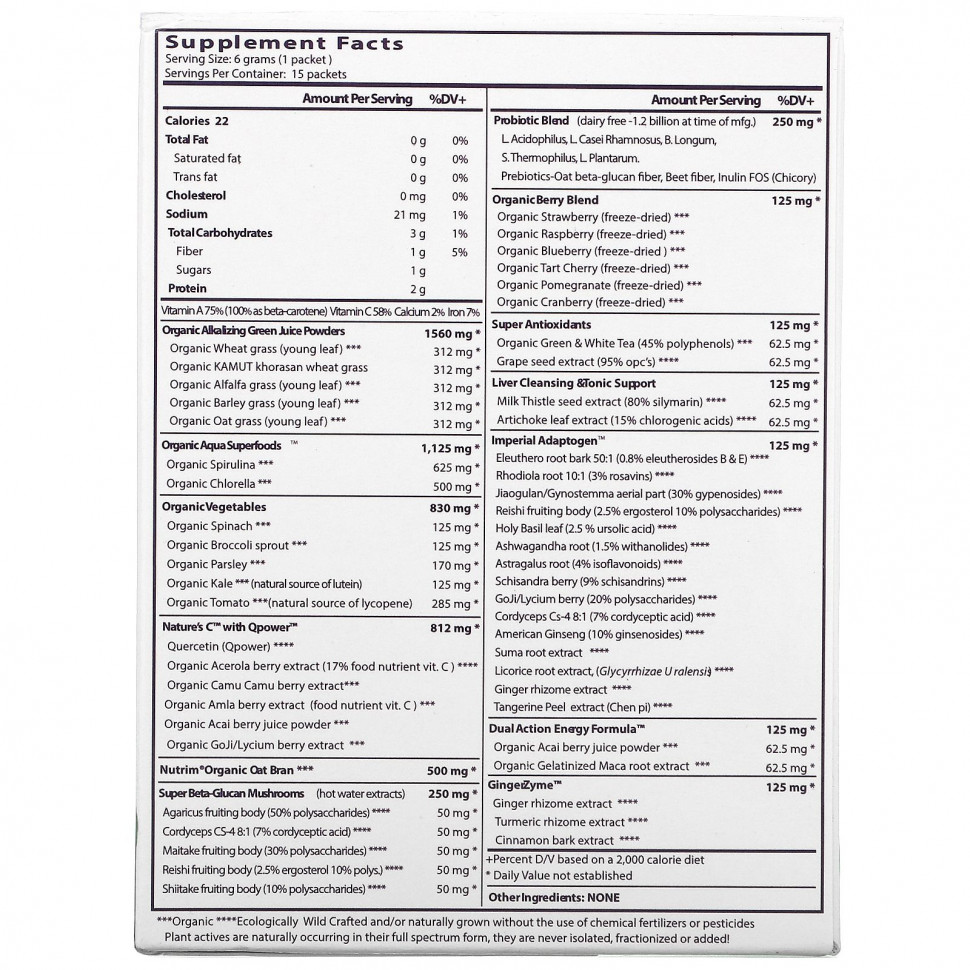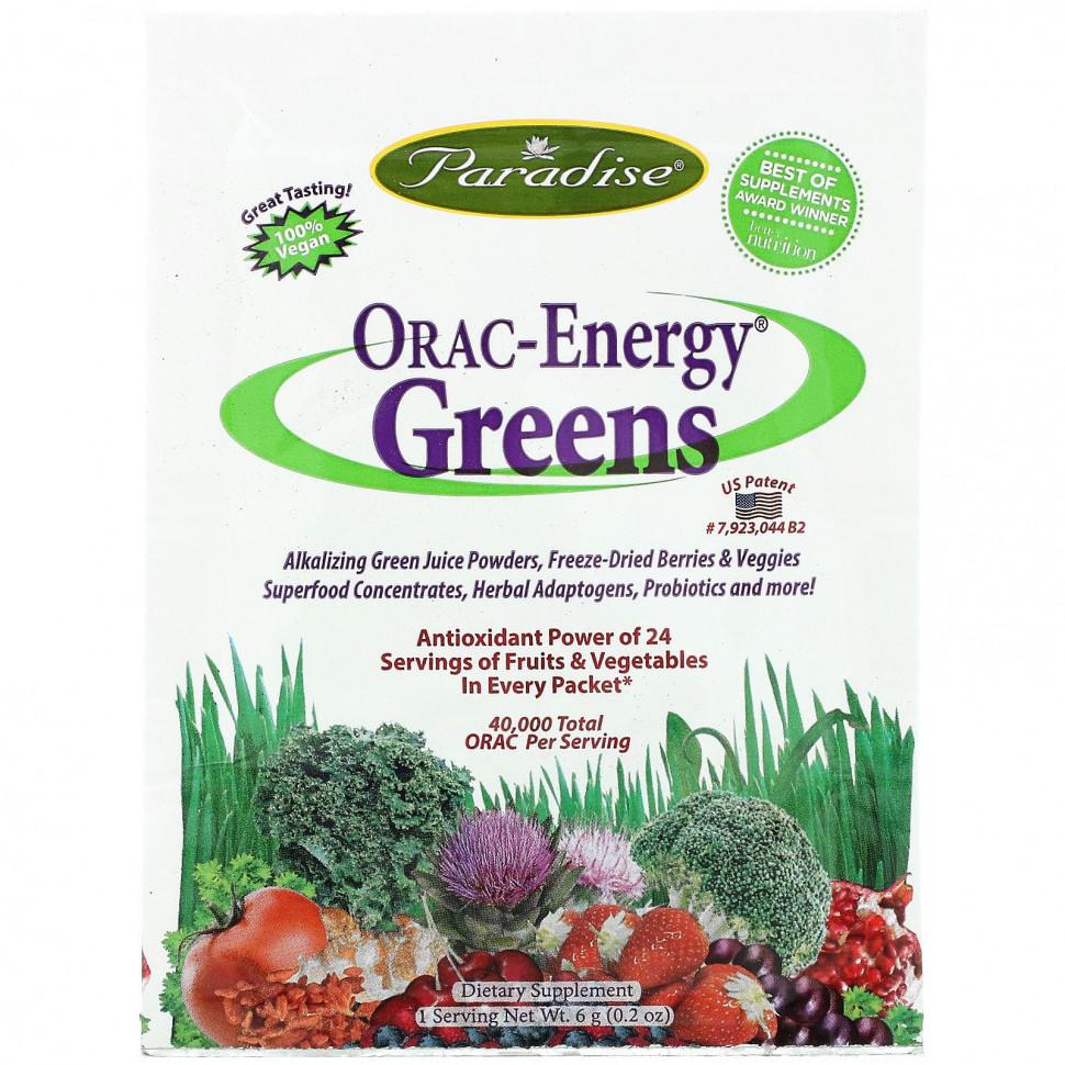 Многие из нас не едят рекомендуемые 9 порций фруктов и овощей в день. Вот почему ORAC (способность поглощать радикалы кислорода) Energy® Greens — идеальная добавка для обеспечения антиоксидантной защиты, в которой мы все нуждаемся. Наша запатентованная формула — это зелень нового поколения, содержащая более 42 сертифицированных органических ингредиентов без пестицидов. В число этих ингредиентов входят порошковые соки с высокой биодоступностью, богатые влагой суперфуды, лиофилизированные ягоды и овощи, поддерживающие иммунитет грибы, снижающие стресс адаптогены, пробиотики и концентраты экологически чистых и/или выращенных в естественных условиях трав. Более 40 000 ORAC на порцию ORAC Energy Greens® обеспечивают антиоксидантную силу более чем 24 порций фруктов и овощей в каждом пакете (6 г). Кроме того, наши экологически чистые травы, выросшие в дикой природе, это нечто большее, чем просто органический продукт, поскольку мы помогаем продвигать справедливую торговлю, сохраняя при этом чистоту окружающей среды, предоставляя коренным народам возможность зарабатывать на жизнь, не изменяя природные ландшафты и не вырубая тропические леса.