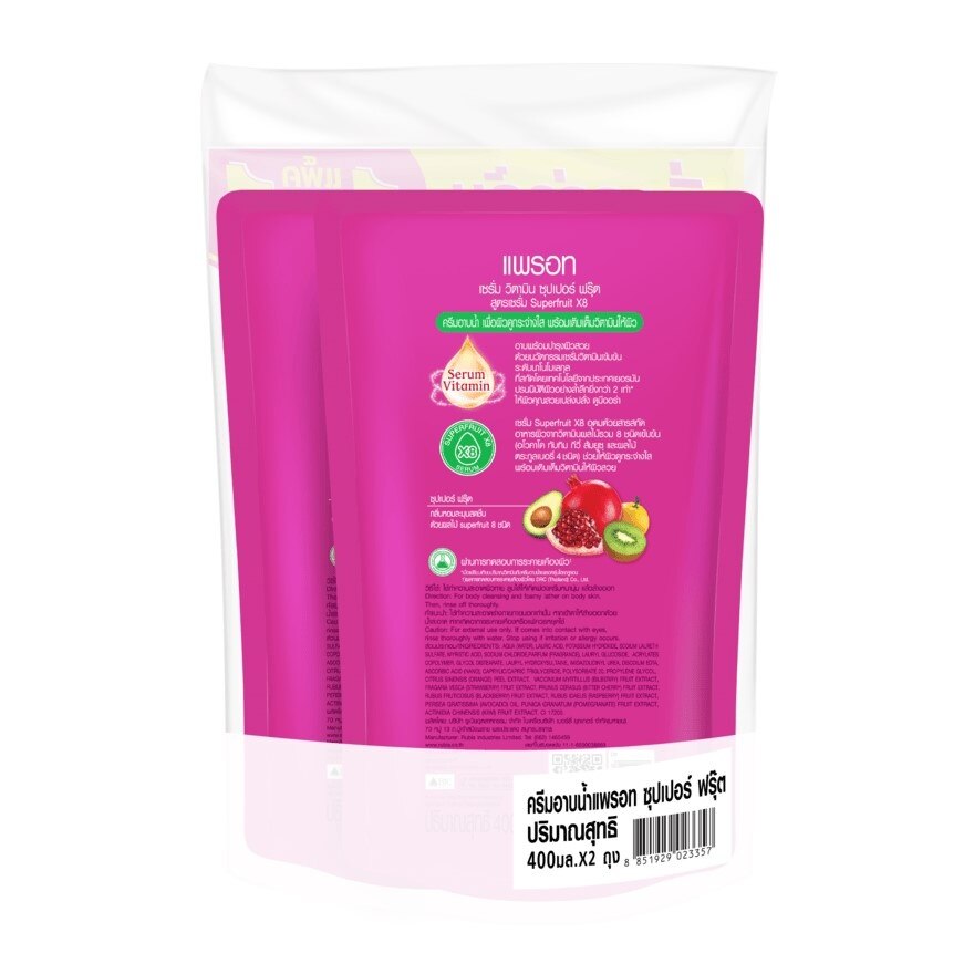 PARROT Phruksa Nokkaew Shower Cream, Super Fruit Scent, the first shower cream with vitamin serum that combines concentrated vitamin serum at the nano-molecule level from Germany. — Helps deeply nourish the skin, giving it a beautiful, fragrant, clear, and radiant complexion. — With a combination of Super Fruit Serum Extract x 8 natural skin foods (avocado, pomegranate, kiwi, yuzu orange, and berries, raspberries, blackberries, strawberries, and cranberries) — Enriched with skin nutrients and 8 types of concentrated fruit vitamins, giving the skin a bright, clear, radiant, and radiant complexion, like adding vitamins to make the skin beautiful and clear.