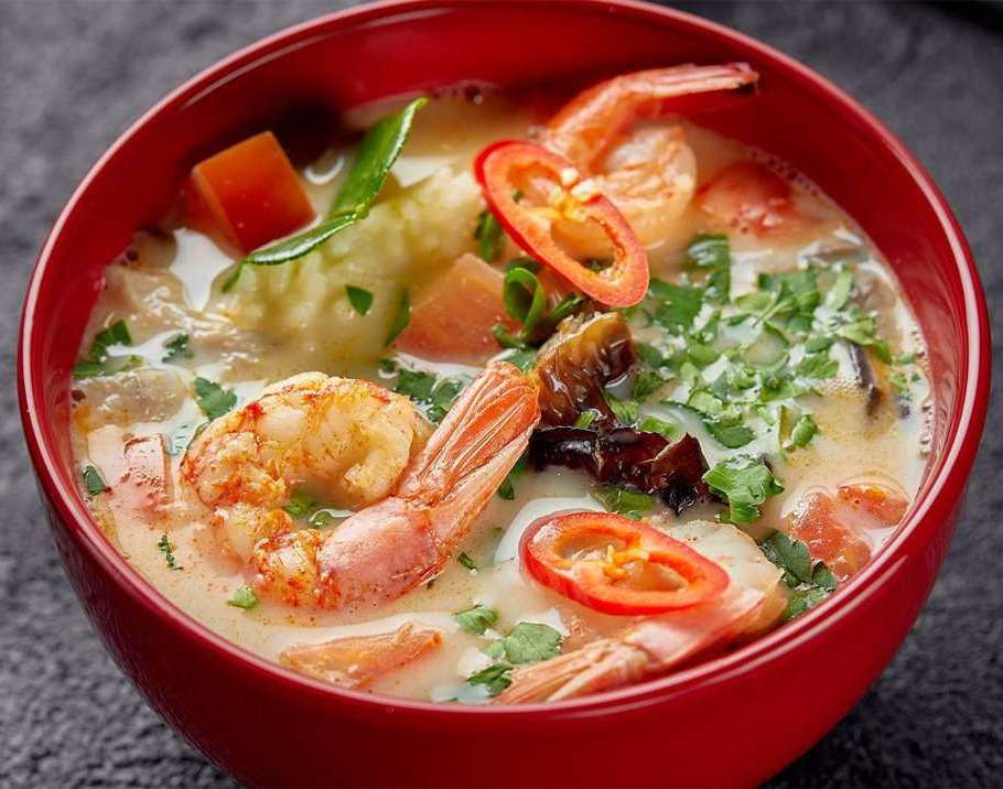 Том ям — целое семейство супов, с общим принципом приготовления. А именно: очень острый, кисло-сладкий бульон, непременно с лемонграссом, острыми перчиками, грибами, пастой Том Ям плюс на выбор: креветки, курица, свинина, говядина, или утка.