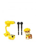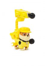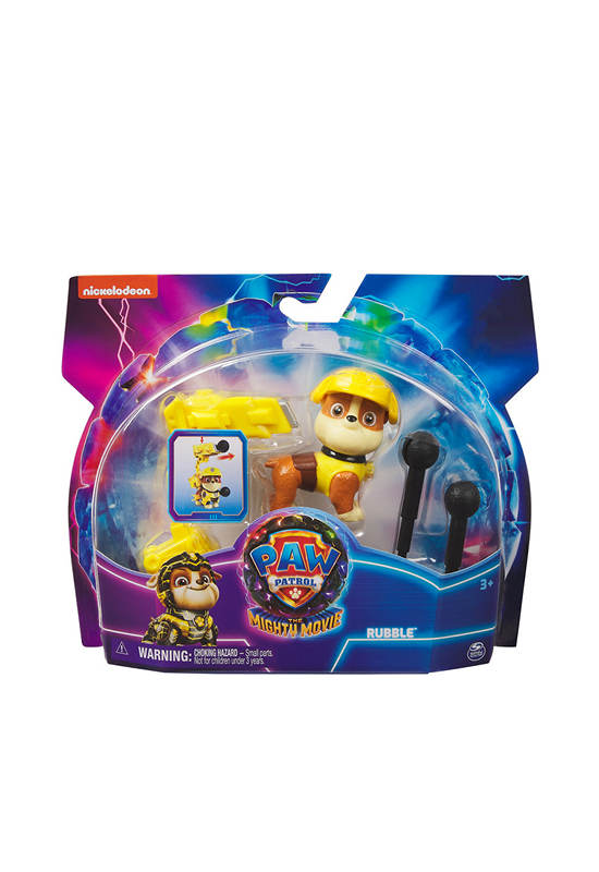 Paw Patrol Mighty Movie Hero Pups Rubble. Rubble PAW PATROL figure features realistic movie details fur detailing and includes a clip-on backpack with two projectiles. When trouble strikes, pop on the backpack to suit up Rubble from his classic uniform into his all-new movie uniform with rescue tools—its so easy. Once Rubble is ready for action load a projectile and press the button on the backpacks launcher to take down obstacles and help save the day. Use your imagination to create your own PAW Patrol (figures and PAW Patrol tower each sold separately).