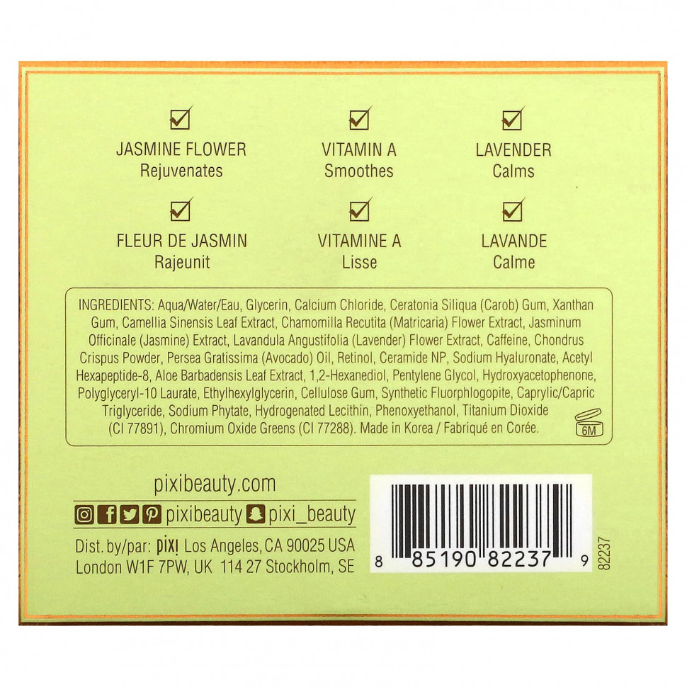 Вода (eau), глицерин, хлорид кальция, камедь рожкового дерева (Ceratonia siliqua), ксантановая камедь, экстракт листьев зеленого чая (Camellia sinensis), экстракт цветков ромашки лекарственной (Chamomilla recutita), экстракт жасмина (Jasminum officinale), экстракт цветков лаванды (Lavandula angustifolia), кофеин, порошок из ирландского мха (Chondrus crispus), масло авокадо (Persea gratissima), ретинол, керамид NP, гиалуронат натрия, ацетил гексапептид-8, экстракт листьев алоэ вера (Aloe barbadensis), 1,2-гександиол, пентилен гликоль, гидроксиацетофенон, полиглицерил-10 лаурат, этилгексилглицерин, целлюлозная камедь, синтетический фторфлогопит, каприловый/каприновый триглицерид, фитат натрия, гидрогенизированный лецитин, феноксиэтанол, диоксид титана (CI 77891), хромовая зелень (CI 77288).