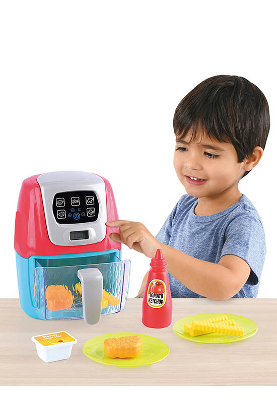 — **Realistic Air Fryer Design**: The set includes a **play air fryer** that looks like the real thing, complete with buttons, knobs, and a handle. Children can mimic the actions of cooking by pretending to fry food, adding an element of realistic play.