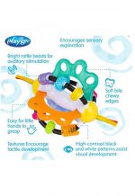 PLAYGRO Prestened the Explor-a-ball is a wonderful way for baby to explore a variety of textures, hard and soft surfaces and vibrant colours. The colourful beads make a click-clack sound when the ball is shaken, stimulating baby’s audio development. Gross motor skills can be practised by shaking and grasping the ball, whilst silky ribbons and moveable beads help practise baby’s fine motor skills.