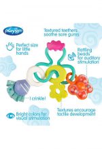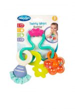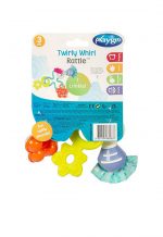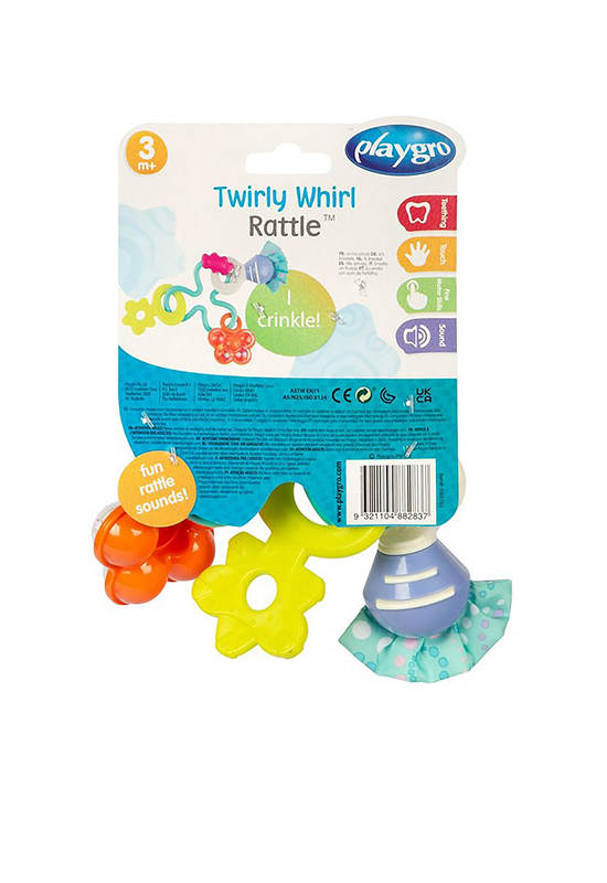 PLAYGRO Presented Twirl, Whirl, Rattle and Shake with the Twirly Whirly Rattle! This rattle is perfect for grasping and shaking, and baby can move the hanging toys around on the curved blue ring. Inside, a hanging toy with cascading beads for listening to and watching the movement of the beads. Featuring crinkle sounds, a teether to soothe sore gums and a rattle with a bell inside, this rattle is great for assisting the development of motor skills!