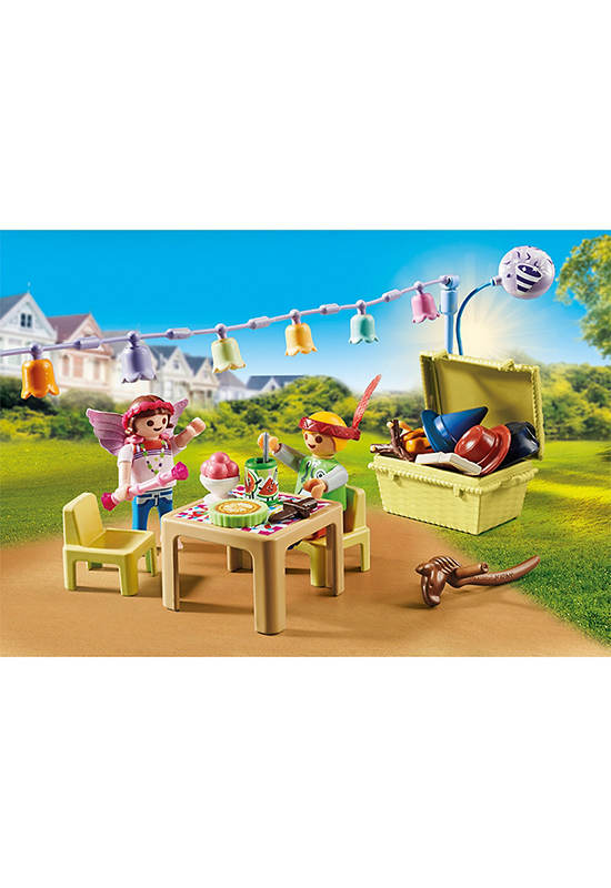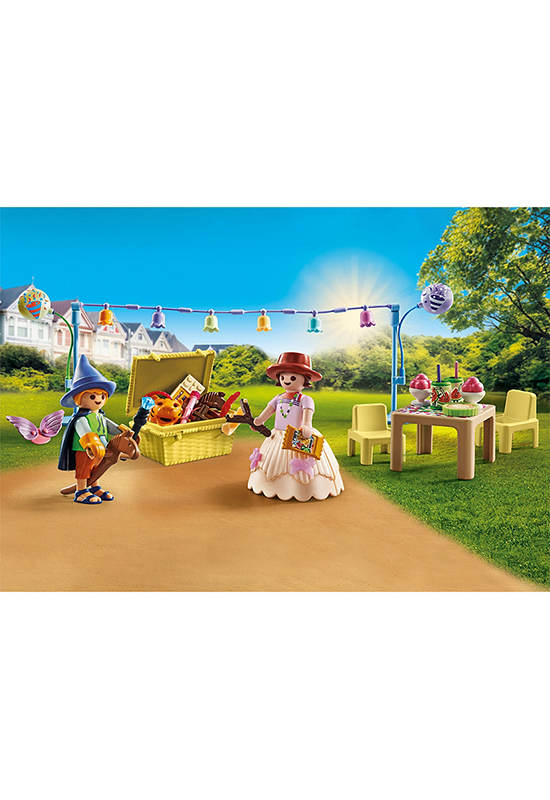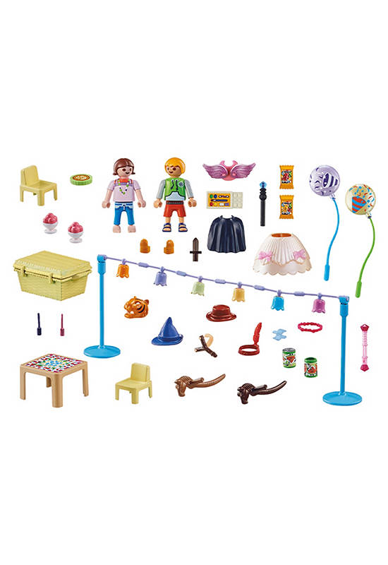 Get ready for the craziest costume party of all time with the brand-new PLAYMOBIL Costume Party Gift Set. And the best part? You can skip the gift wrap because it comes in a stylish packaging! The birthday child is inviting you to the ultimate dress-up party, and with the many costumes available, the kids can step into any role imaginable. Whether it’s a magician with a hat, cape, and wand, a princess with a skirt, headband, and sceptre, a cowboy with a hat and hobbyhorse, or an Indian with a headband, feather, and slingshot — the possibilities are endless. There’s even a tiger with a mask and glove attachments, and a sweet angel with a collar and wings. And when hunger strikes, the little party guests can take a seat at the kids’ table and indulge in delicious strawberry ice cream, cake, candies, and juice from the can. The foldable basket provides room for costumes with accessories. With this gift set, every party turns into a wild adventure where kids can slip into various roles.