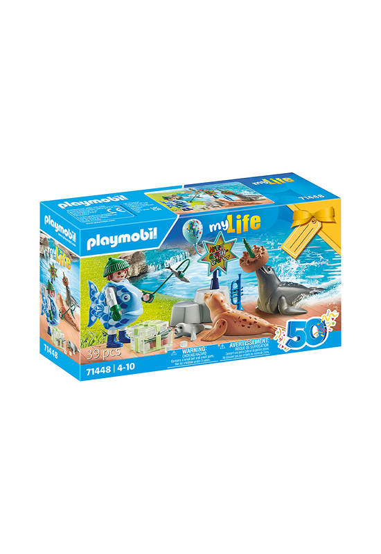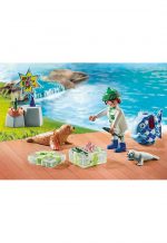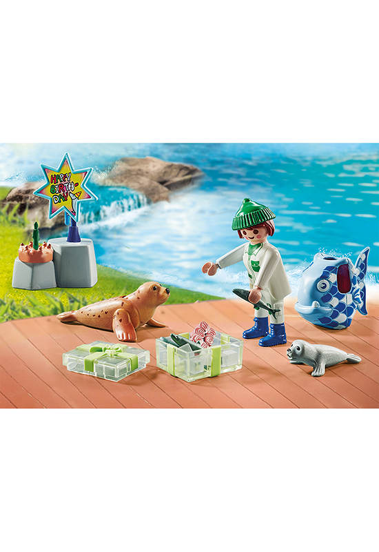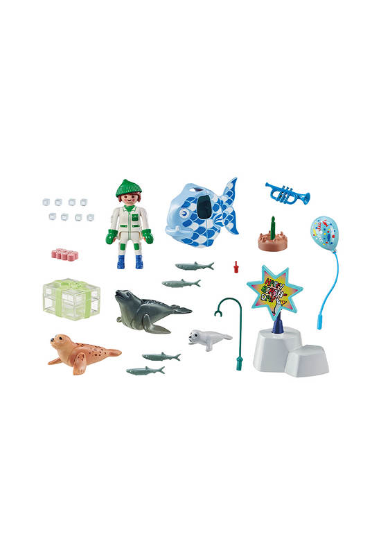 Creativity, fun, and joy await with the PLAYMOBIL Keeper with Animals Giftset! This enchanting set is not just a toy; it’s a party in a box. It comes already packaged in a decorative box that even has space for the birthday child’s name. Say goodbye to the hassle of wrapping – this gift set is already perfectly presented. Dive into the world of underwater birthdays with the adorable seals. In this unique set, the seals celebrate their birthday, and their dedicated animal caretaker is dressed as a fish, equipped with a trumpet for a grand entrance. Using a fishing rod, she feeds the seals a feast of fish stored in a cooler with ice cubes and a giant salmon. But that’s not all! The star of the show is the impressive sea lion, who, with the help of a special adapter, can balance a birthday cake on its nose. Both the sea lion and the seal have movable heads and flippers, adding to the realism of the play.