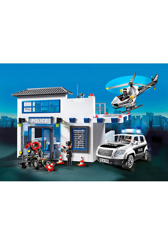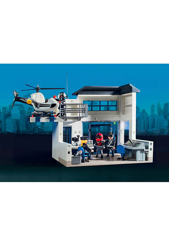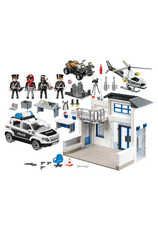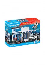 In the command center of the grand police station, an emergency call comes in. A wanted gangster has been spotted on his quad! The large entrance gate of the police station opens, and with wailing sirens, the chase begins. Barely captured, the suspect’s fingerprints are recorded, and the criminal is identified. Through a wall breakthrough, captured criminals can escape from the two cells. The police station has space for a police vehicle (not included), and on the roof, there is a helicopter landing pad.