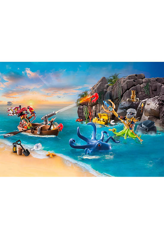 24 doors, 24 surprises for a pirate-themed adventure! The pirate has discovered a treasure map leading him to a large chest filled with valuable pirate gold. He navigates his rowboat towards the treasure cave, his cannon loaded at all times: Not only does a giant octopus stand in his way, but also Dark Kraken, the leader of the dangerous sea monster tribe, himself! The beloved PLAYMOBIL Advent calendars have been sweetening the wait for Christmas for many years, all without chocolate. After the holiday, figures and accessories can easily be integrated into existing PLAYMOBIL play worlds for fun adventures all year round! A perfect Advent gift for imaginative children aged 4 and up.