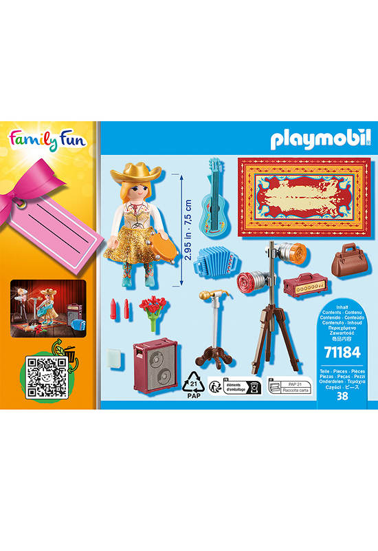 Looking for a suitable gift for little music fans? Then the PLAYMOBIL gift set country singer is just the thing. On stage, the singer is fully in her element. She loves to sing her own songs and accompanies herself with the guitar. But the talented musician also masters the tambourine and accordion perfectly.