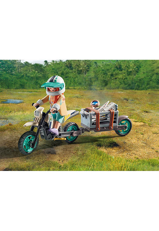 Experience extra-large dino fun with the T-Rex from PLAYMOBIL. On her motorcycle with trailer, the researcher embarks on a quest to uncover traces of the Tyrannosaurus Rex. She succeeds and soon discovers bone fragments and a gigantic footprint. But when the original T-Rex suddenly appears before her, it’s time to stay calm. The PLAYMOBIL Dinosaur World invites kids aged 4 and up to immerse themselves in exciting role-playing adventures and relive the fascination of these giant reptiles at home.