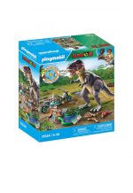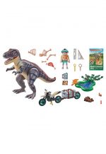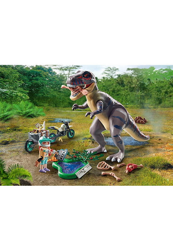 • Cool PLAYMOBIL Dinosaur set featuring a PLAYMOBIL researcher, a Tyrannosaurus Rex, a motorcycle with trailer, a puddle with a footprint, a magnifying glass, camera, map, and additional research equipment.