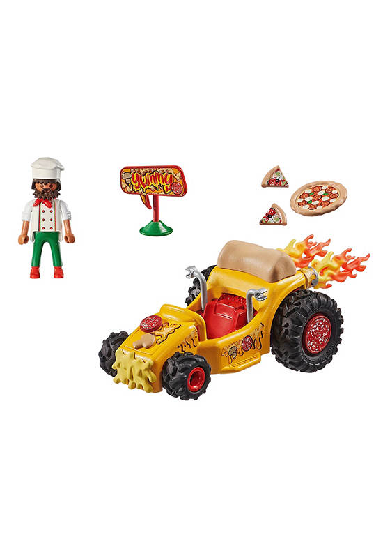 On your marks, get set… Without hesitation, the pizza baker revs up his freshly baked kart with a retractable motor. He engages in a race that satisfies every craving for adrenaline. Different cheese varieties, delicious salami, and a fiery engine heat up the audience. Exciting races, navigating obstacles, or crazy stunts — the PLAYMOBIL Funstars are in action! Pizza and vehicle enthusiasts will be thrilled by this witty PLAYMOBIL car! The amusing new body can be adorned with various accessories, and there’s room for a PLAYMOBIL figure inside the vehicle. A fantastic gift or souvenir for car-loving children aged 4 and up.