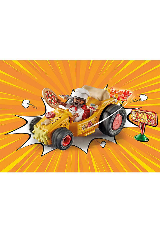 Get ready for some hilarious fun with the PLAYMOBIL Funstars set: Racing Pizza, featuring a PLAYMOBIL figure, kart, and plenty of amusing accessories.
