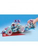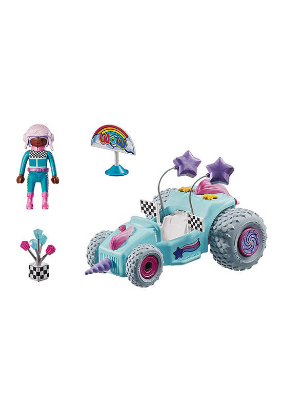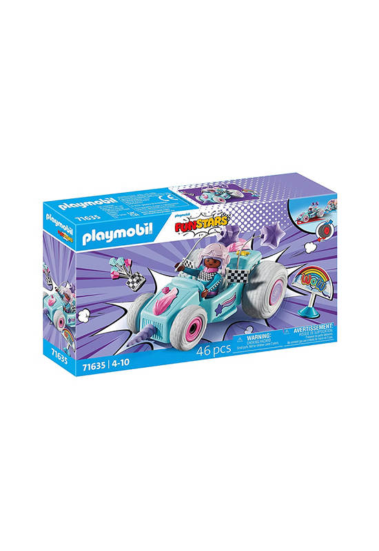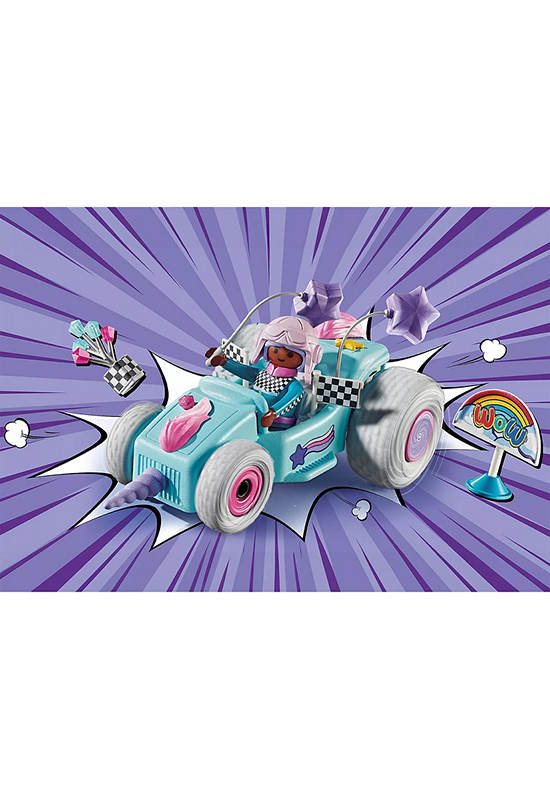 On your marks, get set… Without hesitation, the unicorn racer zooms off in her sugary-sweet and colorful kart with a retractable motor. Flowing unicorn mane, lilac star-shaped balloons, and sparkling drive crystals enchant her competitors. Exciting races, navigating obstacles, or crazy stunts — the PLAYMOBIL Funstars are on the move! This crazy racing unicorn is perfect for all car and mythical creature fans! The fun body with a unicorn on the grille can be accessorized with even more fantastic add-ons. There’s room for a PLAYMOBIL figure inside the vehicle. Thanks to the practical retractable motor, high-speed gaming adventures are guaranteed. A fantastic gift or souvenir for car-loving children aged 4 and up.