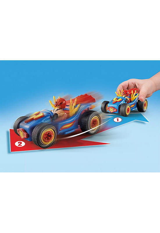 On your marks, get set… Without hesitation, the wrestler zooms off in his kart with a retractable motor. Engage in a race with vivid flashes, fluttering capes, fiery exhausts, effortlessly leaving competitors behind. Exciting races, navigating obstacles, or crazy stunts — the PLAYMOBIL Funstars are here! This crazy PLAYMOBIL car will thrill all wrestling fans. The dynamic new body can be outfitted with various accessories. There’s room for a PLAYMOBIL figure inside the vehicle. With the convenient retractable motor, high-speed play adventures are guaranteed. A fantastic gift or souvenir for car-loving children aged 4 and up.