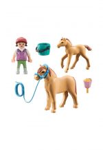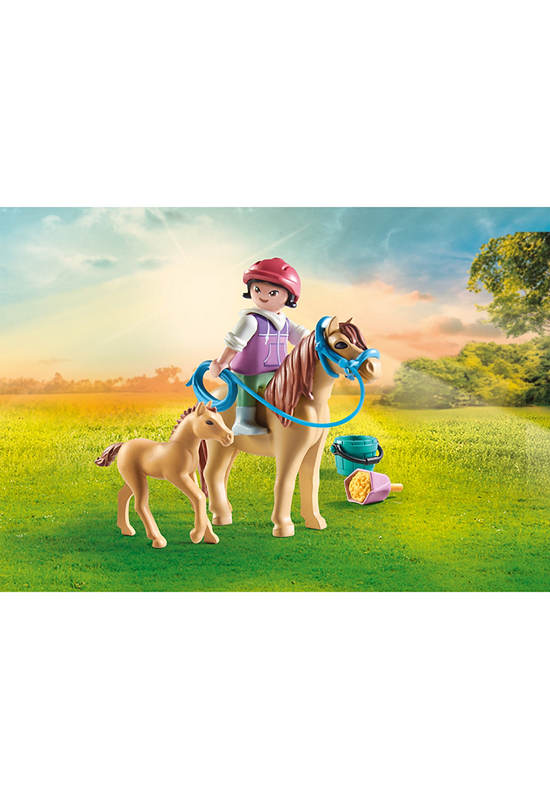 • Lovingly designed PLAYMOBIL horse toy with a child figure, a pony, a foal, helmet, halter, bucket, and many other extras.