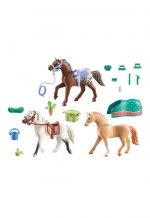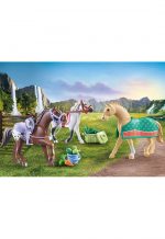 • Detailed playset with three PLAYMOBIL horses, a Morgan, a Quarter Horse and a Shagya Arabian, saddle blanket, curry comb set, saddle, bridle and many other accessories for horse care