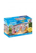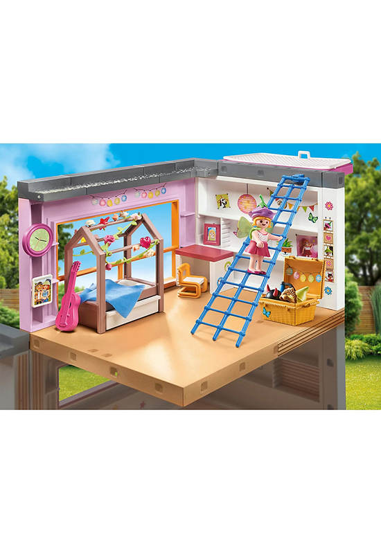 The lovingly equipped children’s room is the perfect retreat for youngsters. Here, you’ll find a bed with a garland, a dress-up box, a chill-out net that can also be installed in other parts of the house, and a ladder to reach the net. With removable stickers, the room can be decorated to taste. For the individual expansion of the new Living House with winter garden (71607). Perfectly combinable with other Living House sets from PLAYMOBIL.
