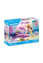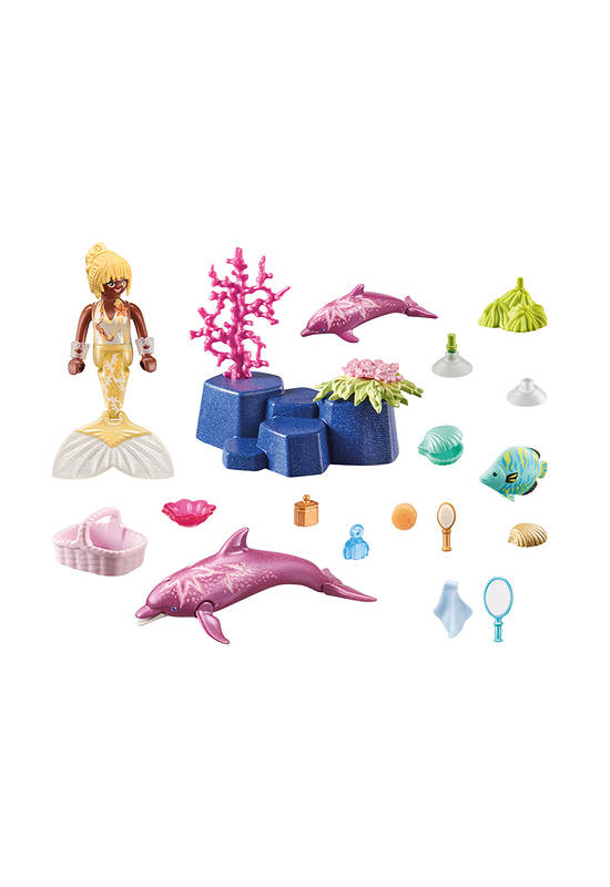 Embark with the mermaid into the endless depths of the shimmering PLAYMOBIL underwater world. Tending to marine life is one of the vital tasks of the underwater community. The mermaid lovingly cares for the dolphin mother and her offspring. With imaginatively designed figures, animals, and fantastic accessories, the PLAYMOBIL Princess Magic Underwater World invites children into a magical play universe. The PLAYMOBIL set includes a mermaid, a dolphin with a baby, a rock with coral, and many other exciting extras for thrilling role-playing. An ideal gift or souvenir for children aged 4 and up.The mermaid collects magical shimmering pearls. With shell box and decorative shell to attach to smooth surfaces (incl. suction cups).