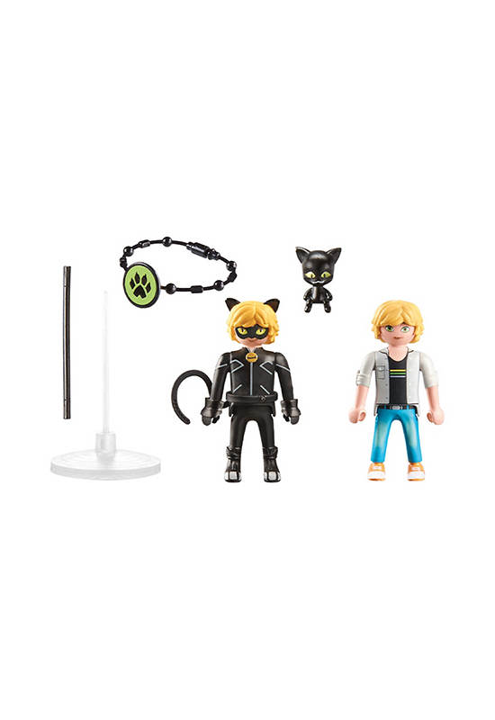Embark on an exciting adventure into the world of Miraculous with the new PLAYMOBIL playset Miraculous: Adrien & Cat Noir! Experience unforgettable moments with Adrien in two thrilling variants — once as Adrien himself and then transformed into the fearless superhero Cat Noir. Plagg, the Kwami, is also included. The set features a child-sized bracelet with one of seven different charms to collect all your favourite characters. The Kwami is attached to the transparent tip of the stand, creating the illusion of it floating. Dive into the wonderful world of Miraculous and discover your heroic abilities with the Miraculous: Adrien & Cat Noir PLAYMOBIL playset. Be ready for an epic adventure, defeat the villains, and protect the city from evil, just like Cat Noir!