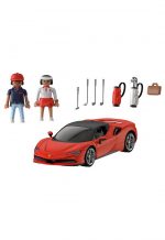 Set includes a Ferrari SF90 Stradale with light effects, two figures, golf bags, a suitcase, and other accessories.