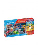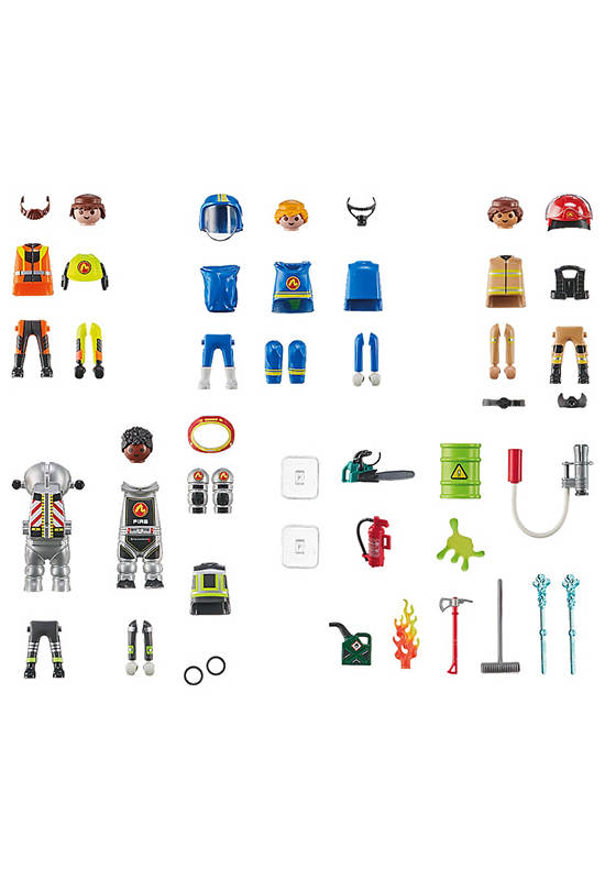 Discover the diversity of PLAYMOBIL MyFigures Fire Rescue – creative, unique, and colourful! This set introduces endless design possibilities with four different special units of the fire brigade. The figures come equipped with removable headgear, arm guards, protective suits, and more. Mixing and matching heads, bodies, arms, and legs create ever-new, imaginative creations. Authentic accessories like a fire axe, chainsaw, fire hose, and silicone puddle bring every mission to life. Two baseplates ensure stability, while the portable water spray and fire cannon provide action-packed fun. An ideal gift for young firefighting enthusiasts aged 4 and up!