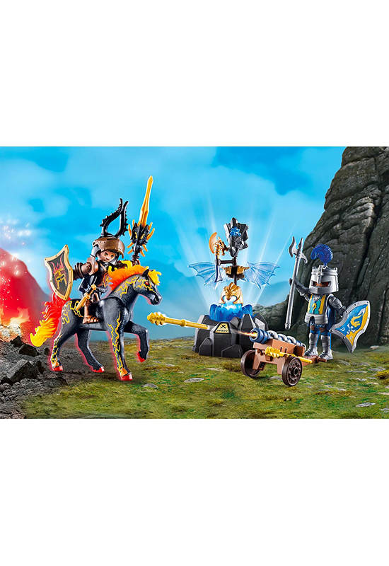 The knights of Novelmore and the Burnham Raiders engage in a heated duel for the powerful Dragon Armor – the one that enables its wearer to soar into the skies like a dragon! Who will emerge victorious in the duel? Novelmore’s knight with the cannon or the black knight on horseback? With creative weapons, clever defense systems, and original characters, the PLAYMOBIL knight world Novelmore invites to endless role-playing adventures. A fantastic gift or souvenir for knight enthusiasts aged 4 and up.