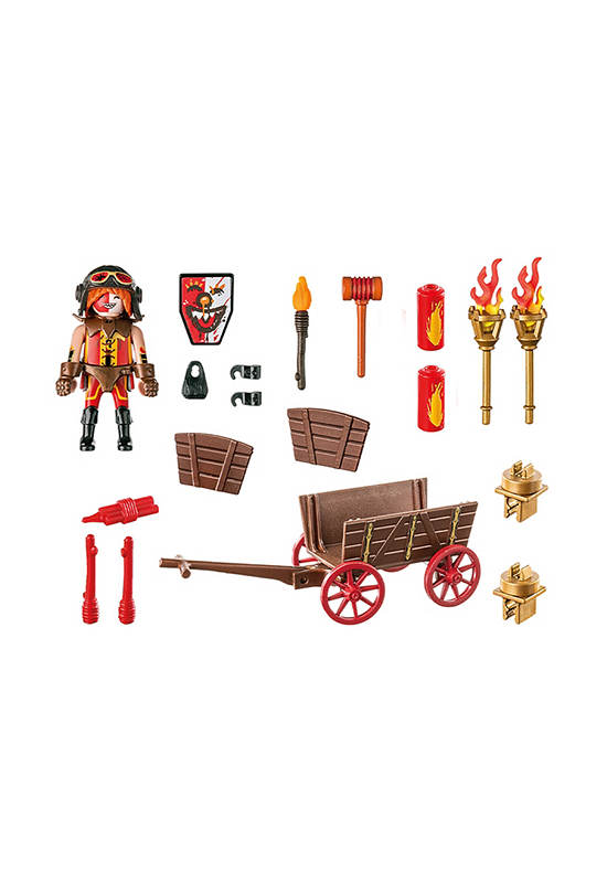 The Novelmore knights play world by PLAYMOBIL is full of adventures: Kahboom, the fire-crazed court jester of the Burnham Raiders, plunges into the action with his racing cart. Equipped with dynamite and torches, Kahboom is unpredictable. However, the Knights of Novelmore also know how to defend themselves. With great heroes, cunning villains, mysterious creatures, and clever weapons, Novelmore offers immense fun for creative children aged 4 and up. The play figure set includes a PLAYMOBIL figure, dynamite stick, hammer, torch, aviator cap, gloves, and many other exciting extras.