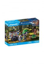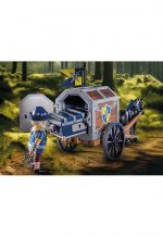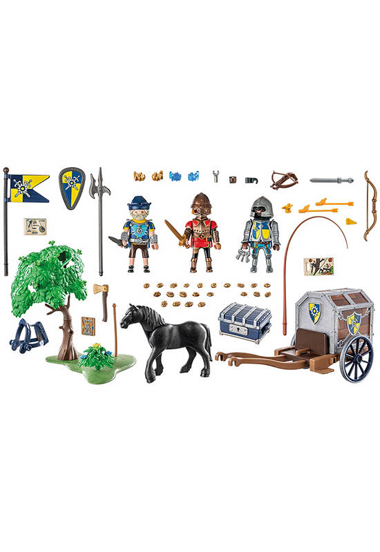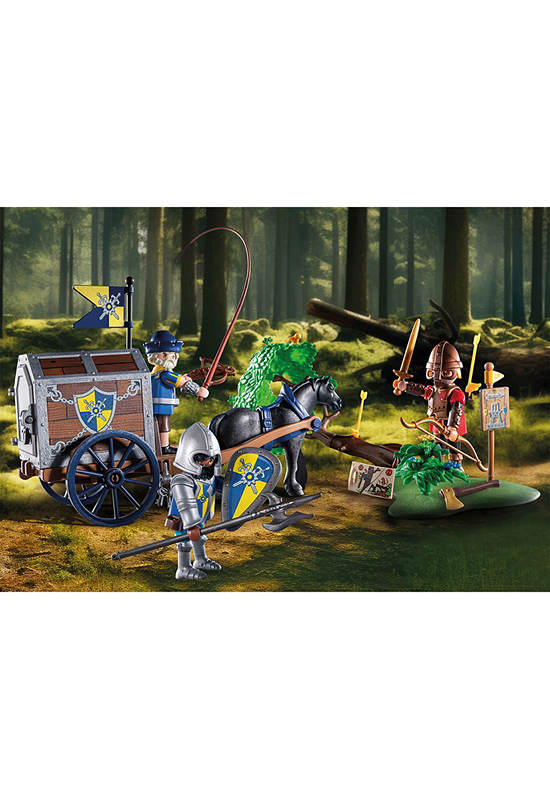 The Novelmore knights play world by PLAYMOBIL is full of surprises: In their transport wagon, the Knights of Novelmore not only have secret blueprints but also loaded dragon gold. The Burnham Raiders have their sights on this valuable cargo and fell a tree to stop the transport wagon. However, the Novelmore knights will do everything to defend their property. With great heroes, cunning villains, mysterious creatures, and clever weapons, Novelmore offers immense fun for creative children aged 4 and up. The playset includes three PLAYMOBIL figures, a horse, a base plate with a tilting tree, a bow and arrow, gold, a crossbow, and many other fantastic extras for exciting role-playing in the children’s room.