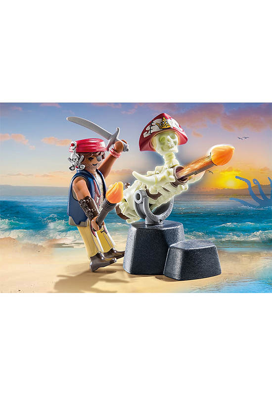 The rotating and pivoting skeleton cannon of the pirate gunner is ready to fire and never misses its target. Includes skeleton elements that glow in the dark.