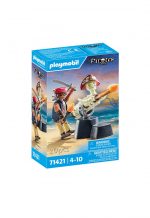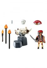 Beware, ye landlubbers! The fierce pirate loads his bone cannon and drives away all attackers and sea monsters with his fiery projectiles. A fantastic playset for all pirate fans aged 4 and up. The bolt cannon is mounted on a rock and can be rotated and swiveled. Bracelets, leather cuffs, and a headband can be removed from the figure.