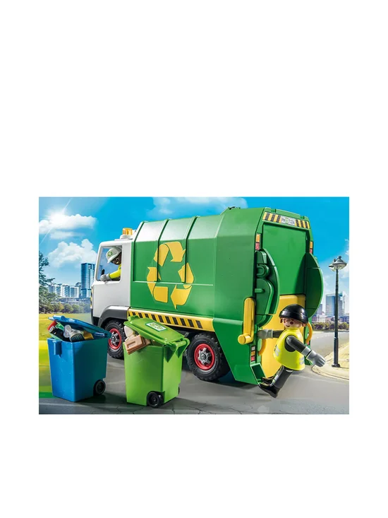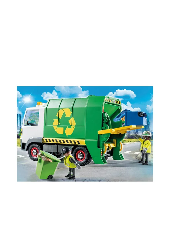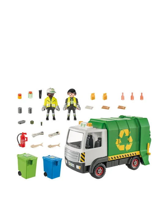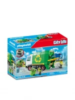 Help keep the city clean with the PLAYMOBIL Recycling Truck. This PLAYMOBIL City Life Recycling Truck comes with many realistic features, such as two bins and lots of garbage to collect and recycle. Help the sanitation workers to load the bins on the back of the truck and then pull the lever to lift and empty each container. To empty the vehicle, the entire container is tilted up and the rear attachment is lifted. Easily access the driver’s cab thanks to the removable roof. Two members of the sanitation department can ride in the vehicle. Just like the real thing: The figures can stand on the left and right at the rear of the vehicle, holding on to the grab handle while driving.